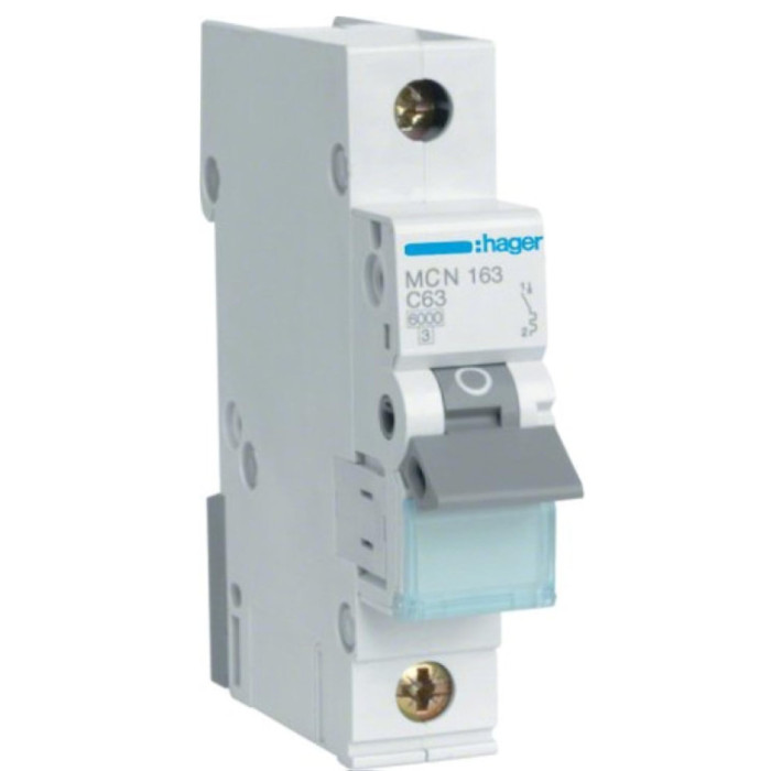 Описание Автоматический выключатель Hager MCN163 In=63 А, 1п, С, 6 kA, 1м