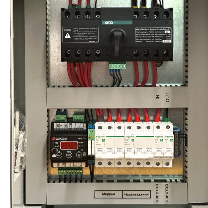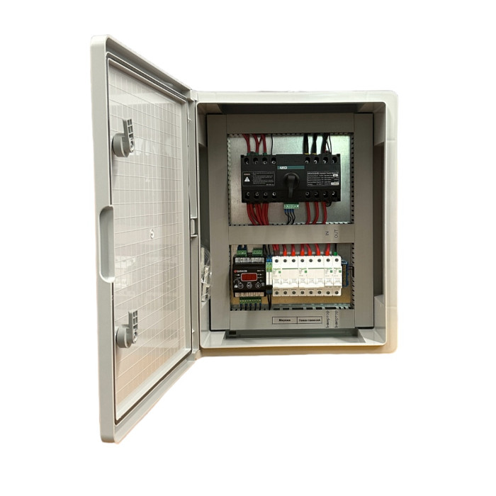 Щит АВР (коммутации) для подключения инверторов любого типа к дому с сетью 380 или 220 В. Он исполнен на базе контроллера Datakom DKG-175. Имеет моторизованный сервопривод. Щит коммутации контролирует фазы входной сети 380В/220В, контролирует напряжение инвертора и защищает объект в случае, если напряжение выходит за нормы. Также автоматика может при необходимости давать команду на запуск генератора(опция)(потребуется щит автоматики генератора), если разрядились аккумуляторы, не исключая нагрузки от инвертора. Таким образом, срок эксплуатации аккумуляторов увеличивается. Автоматика используется, если мощность устанавливаемого инвертора(ИБП) меньше, чем мощность водного автомата дома/квартиры, и вы не можете включить весь дом/квартиру через инвертор. Или в случае, если используется однофазный инвертор, для того чтобы раздавать одну фазу в трехфазной сети дома.