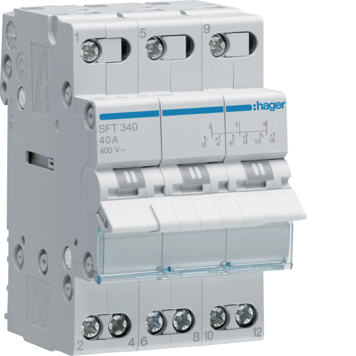 Hager SFT340 — это надежный трехполюсный модульный переключатель (рубильник) с тремя положениями (I-0-II), предназначенный для ручного переключения питания трехфазной нагрузки между двумя независимыми источниками, например, между основной сетью и генератором. Конструкция обеспечивает гарантированный разрыв цепи в среднем положении «0», что полностью исключает возможность встречного включения источников и короткого замыкания.
