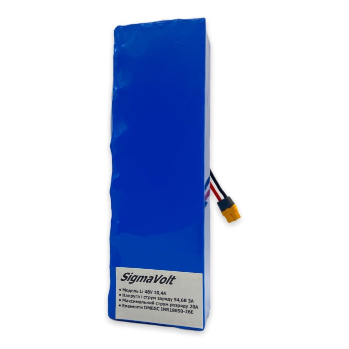Батарея СигмаВольт Li 48V 10.4Ah BMS 20A/3A 18650 - это литий-ионная аккумуляторная батарея, предназначенная для использования в электрических велосипедах, самокатах, мотоциклах, гольфкарах и других подобных устройствах.