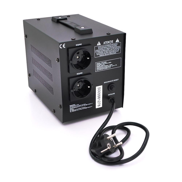 Микропроцессорное управление и технология переключения в нулевой точке переменного тока гарантируют плавную стабилизацию без помех для подключенной техники. Двойной цифровой дисплей отображает входящее и выходное напряжение, а металлический корпус обеспечивает надежную защиту электроники и долговечность устройства.