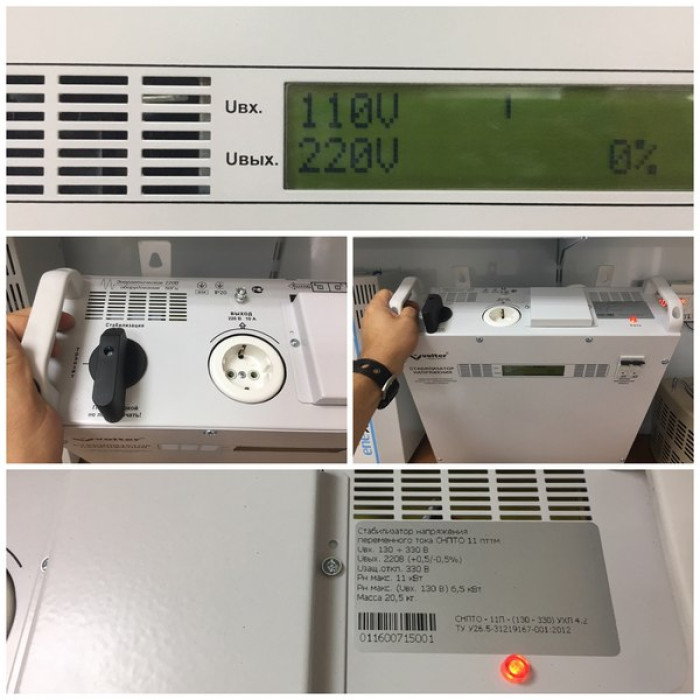 - диапазон мощности стабилизатора 9, 11 и 14кВт - от 130 до 330В, ±0,5%, отключение при пониженном напряжении -105В и при повышенном напряжении -330±5В.