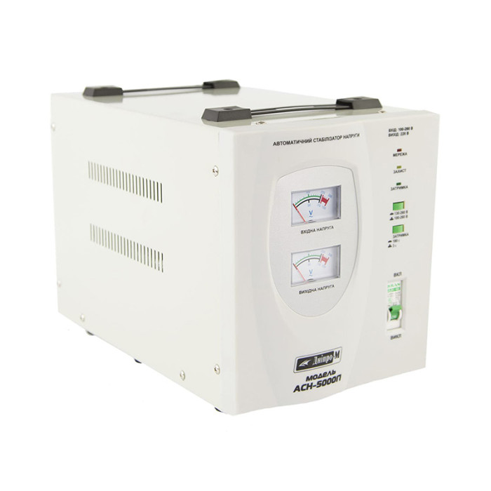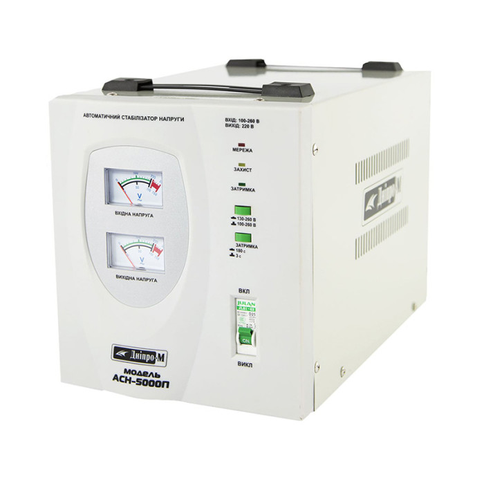 Днепр-М АСН-5000П выполнен в корпусе полочного типа, ее удобно переносить и размещать на горизонтальных поверхностях. Во всех полочных моделях реализована аналоговая индикация (стрелочный вольтметр). Если Вам больше по душе индикация цифровая, то выбирайте модели настенные (которые, в принципе, тоже можно расположить вертикально на полке или на любом предмете мебели, не осуществляя настенный монтаж), к примеру: Днепр-М АСН-5000Н. Такой стабилизатор будет иметь абсолютно аналогичные характеристики, что и Днепр-М АСН 5000П, а ничтожная разница в стоимости (около 50 грн) обусловлена только другим типом корпуса.