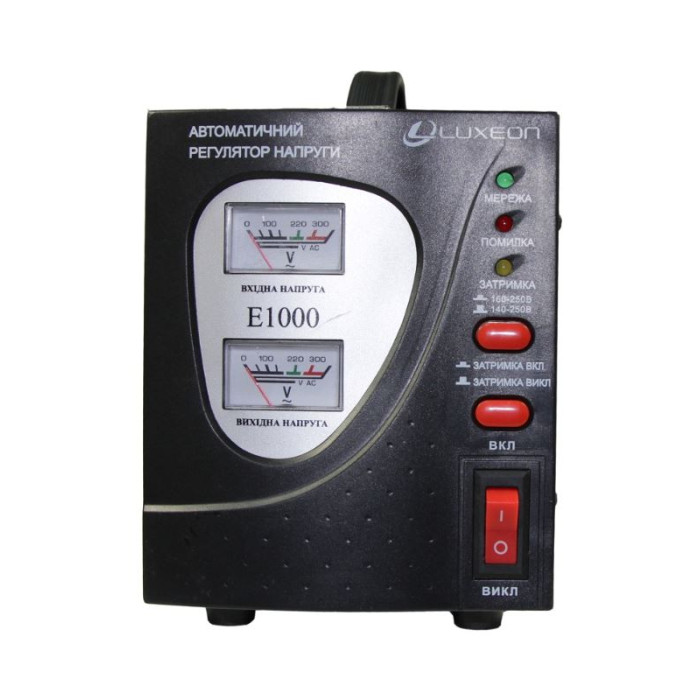 Для контроля за работой релейного стабилизатора напряжения Luxeon E1000 на лицевой панели расположены два аналоговых вольтметра, отвечающих за отображение входного и выходного напряжения.