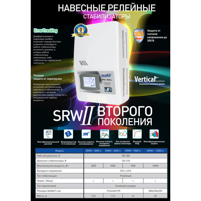 Модельный ряд релейных однофазных стабилизаторов напряжения RUCELF второго поколения представлен усовершенствованными моделями навесного (SRW II) и напольного (SRF II) исполнения в диапазоне мощности от 3000 Вт до 10000 Вт. Данные модели отличаются высокими техническими и эксплуатационными характеристиками и обеспечивают высокую точность поддержания стабильного напряжения на выходе прибора (±3,5 %).