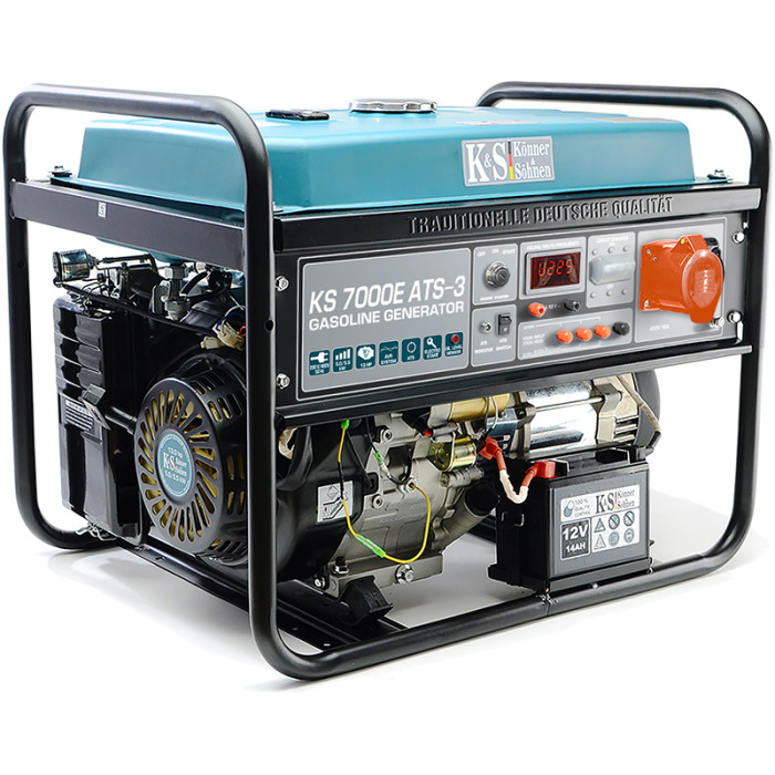 По-перше, бензиновий генератор Könner&Söhnen KS 7000E ATS-3 досить потужний. Його фірмовий двигун власного виробництва KS 390 у парі із синхронним альтернатором здатні виробляти до 5.5 кВт. Це означає, що бензиновий генератор, що розглядається, впорається як з резервним харчуванням приватного будинку, так і з електроінструментами у виробничих приміщеннях і на будмайданчиках. Крім іншого, двигун оснащений електростартером.