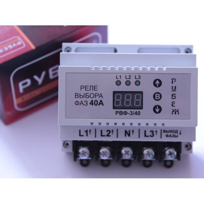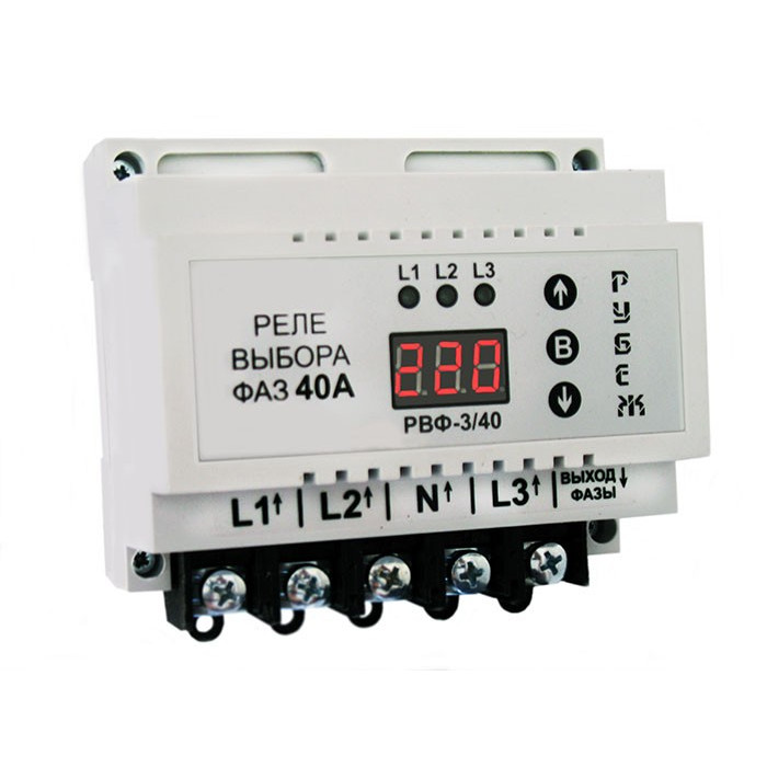 Реле вибору фаз РУБІЖ РВФ-3/40 - це вкрай цікавий різновид реле напруги. Тут принцип роботи теж заснований на контролі вхідної напруги та своєчасному відключенні навантаження у разі фіксації неприпустимого значення, але з низкою застережень. Тепер живлення приходить за трьома фазами, хоча для роботи приладу і, відповідно, навантаження достатньо підключити хоча б одну фазу. Завдання КОРДОНУ РВФ-3/40 полягає в тому, щоб своєчасно перемикати споживача на найсприятливішу з точки зору напруги фазу. Якщо Ви підключите всього одну фазу, то реле вибору фаз буде працювати як звичайне реле напруги, своєчасно відключаючи навантаження при виході напруги за робочий діапазон.