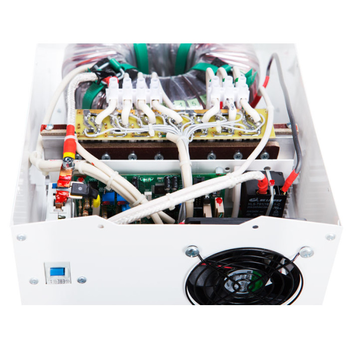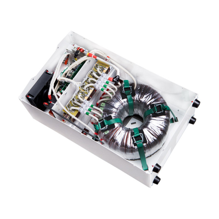 Зібраний аналізований стабілізатор на основі потужного тороїдального автотрансформатора, обмотка якого розділена безліччю висновків. Комутацією цих висновків і досягається регулювання вихідної напруги. Як це відбувається? Контролер безперервно вимірює вихідну напругу, щоб вона відповідала заявленій точності. Як тільки виникає відхилення, автоматика миттю (час стабілізації не більше 20мс) комутує вихід до іншого ступеня, який відповідає потрібній точності. Стабілізатор напруги розрахований на утримання напруги на рівні 220В з точністю 4% у робочому діапазоні 145-265В. Якщо коливання мережі перевищують допустимий діапазон, стабілізатор працюватиме з меншою точністю. Лише коли відхилення досягають граничного значення, відбувається автоматичне вимкнення з метою недопущення пошкодження обладнання. Тому навіть при лавиноподібних стрибках стабілізатор встигне відключити Ваше обладнання.